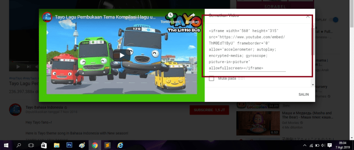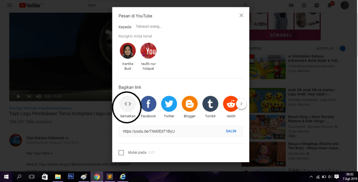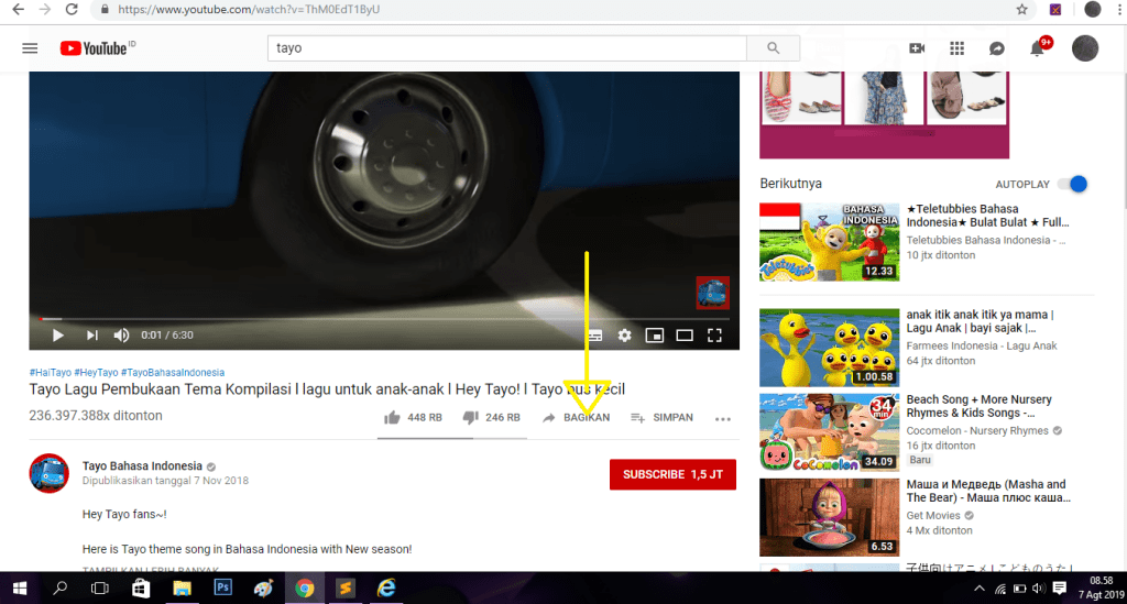 pertama-tama kalian buka youtube terlebih dahulu, lalu cari video yang kita inginkan misalnya saya akan memilih video TAYO. lalu klik “bagikan”